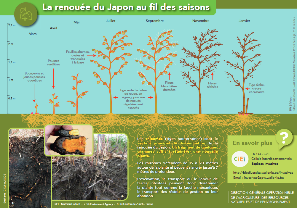 Les renouées asiatiques se reproduisent principalement par bouturage au départ de fragments de rhizomes ou de tiges. Elles produisent rarement des graines viables en Wallonie.