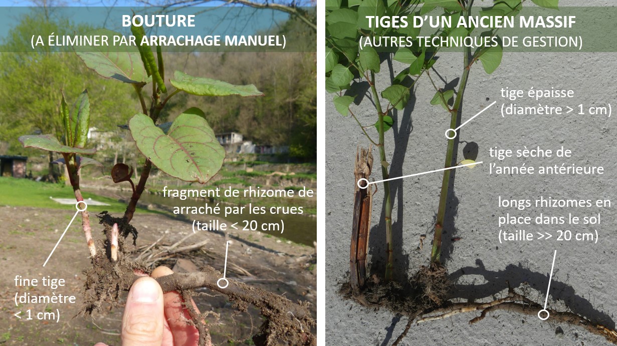 Le déplacement de fragments de tiges ou de rhizomes de renouées par les crues ou par l’homme (mouvements de terre) sont à l’origine de la formation de nouveaux massifs. Ces derniers peuvent être assez facilement éliminés durant les premières années qui suivent leur installation, tant que leur taille reste relativement modeste. Cette destruction peut être réalisée par déterrage précoce des nouvelles boutures (jusqu’à 2 ans après leur installation) ou par arrachage répété des rhizomes lorsqu’il n’est plus possible de les déterrer complètement et que la taille des nouveaux massifs n’excède pas quelques mètres carrés.