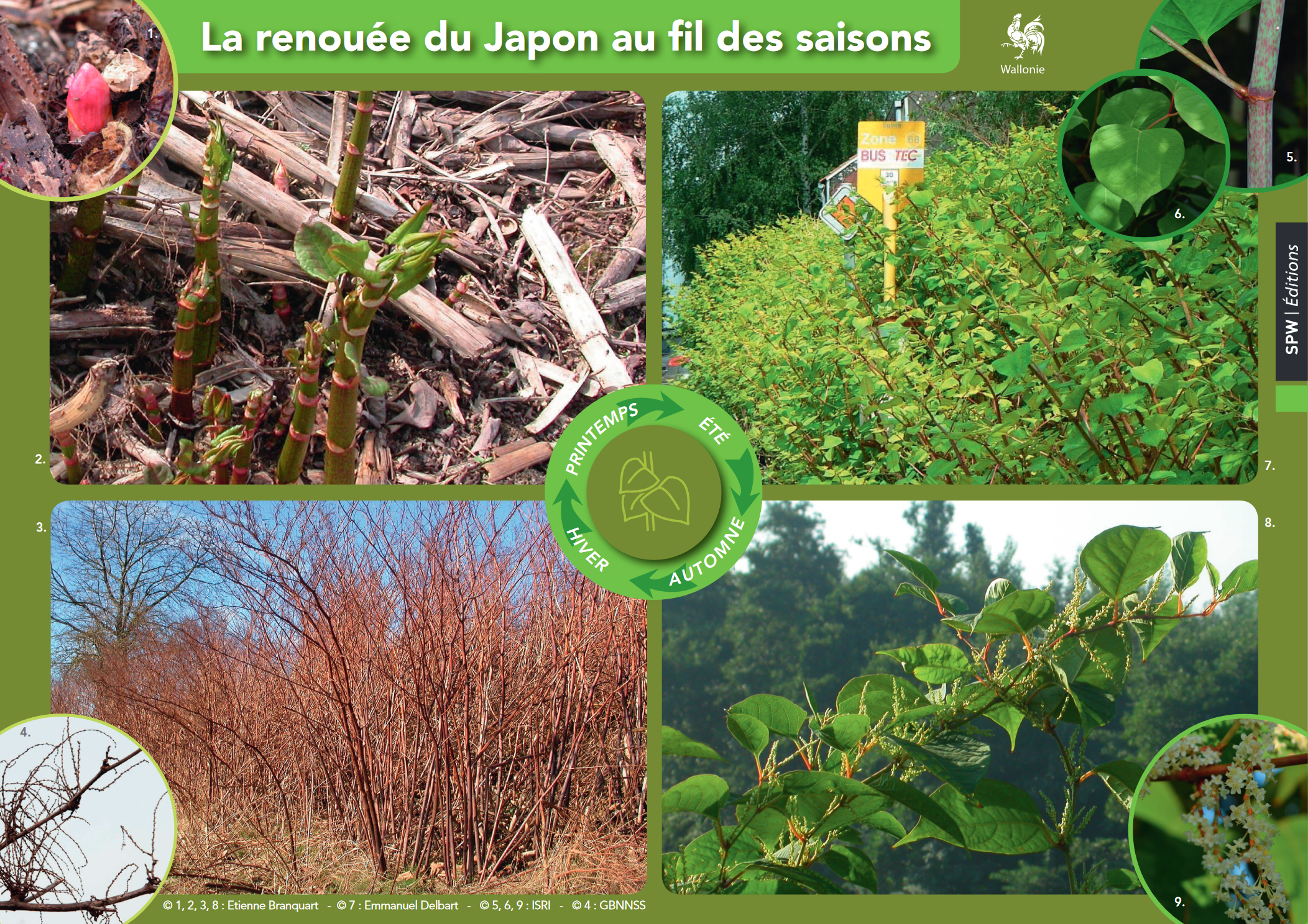 On trouve en Wallonie quatre espèces de renouées asiatiques envahissantes en Wallonie, difficiles à distinguer les unes des autres. Elles se comportent de la même manière et développent toutes les quatre un puissant système de tiges souterraines dans le sol (rhizomes). Elles sont très difficiles à éliminer du fait de leur forte capacité de régénération :